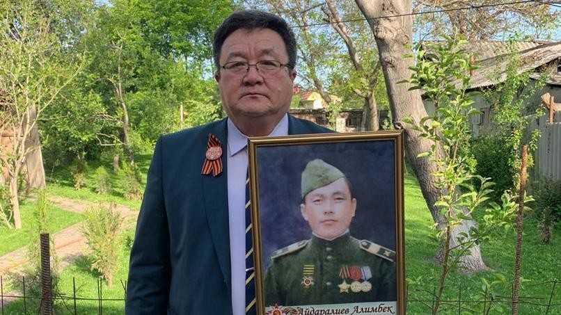 «Алимбек Айдаралиев родился в 1919 году. Он был призван в ряды Красной Армии в 1939 году и нес службу в кавалерийских войсках в Белоруссии. Великую Отечественную войну встретил в Белоруссии в 1941 году и закончил в Кенигсберге в 1945 году.