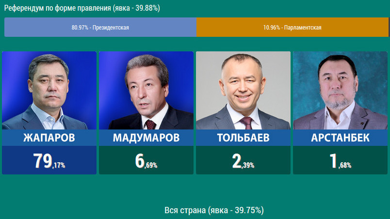 Предварительные итоги выборов на 03:00: Лидирует Садыр Жапаров — 79.17%