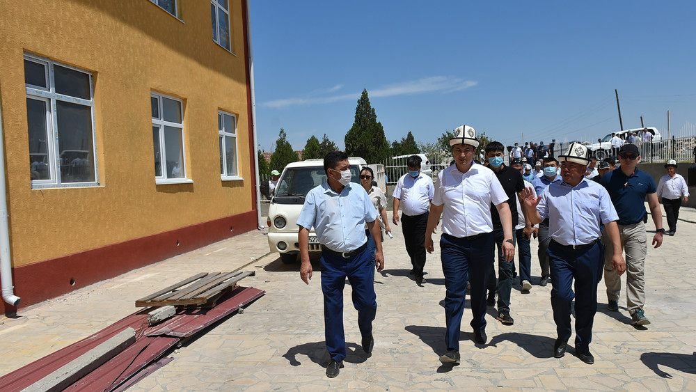Глава кабмина ознакомился с ходом восстановительных работ соцобъектов в селе Максат, пострадавших в ходе конфликта на границе