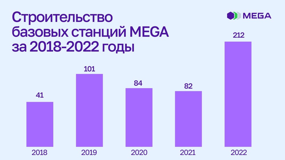 Стремительную динамику техразвития MEGA доказывает статистика. Всего по стране с 2018 по 2022 годы компания построила 520 базовых станций, 40% из которых оператор ввёл в эксплуатацию в прошлом году. По сравнению с 2018 годом рост в 2022 году составил 517%, с 2021 годом – 258%.