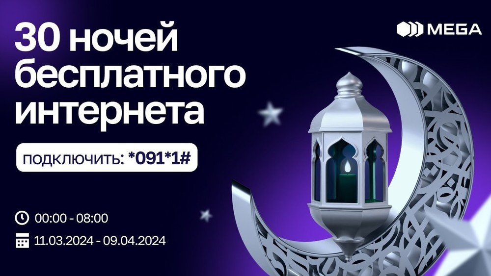 В честь наступления священного месяца Рамазан компания MEGA дарит своим абонентам 30 ночей безлимитного интернета в рамках тарифной опции «Ночь без границ». Пользуйтесь безлимитным объемом интернет-трафика на максимально возможной скорости, а также совершайте звонки и отправляйте SMS внутри сети бесплатно с 00:00 до 08:00.