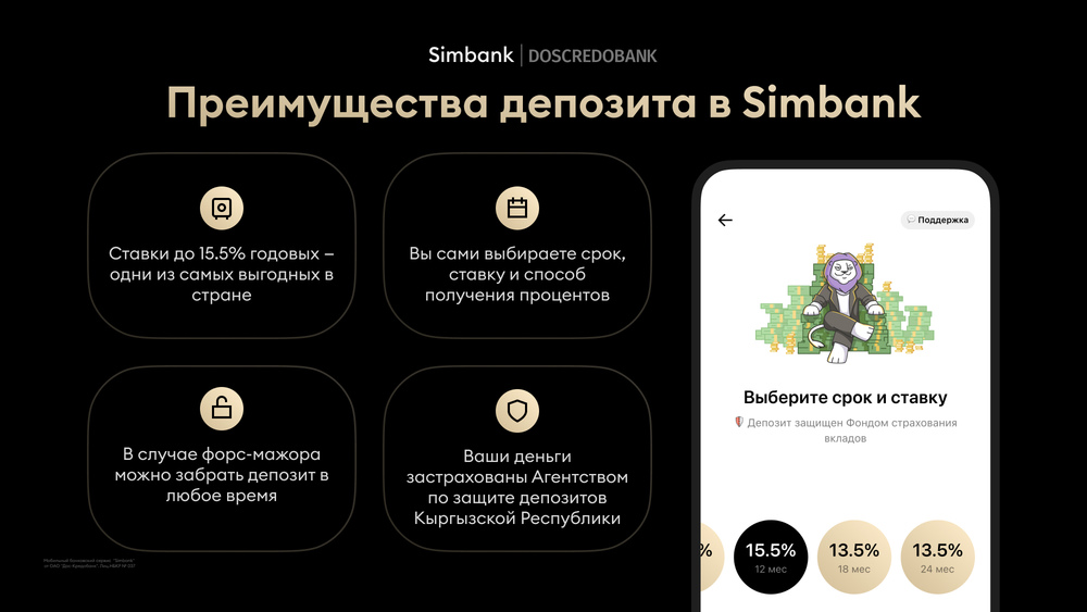 Бишкек (АКИpress) – Simbank — мобильный банковский сервис от Doscredobank — продолжает активно развиваться и предлагать клиентам новые финансовые решения. Теперь в приложении Simbank можно открыть депозит всего за пару минут, без визита в отделение и лишних документов.