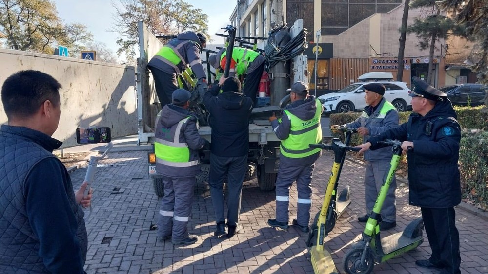 Из центра Бишкека убрали 55 самокатов, которые были оставлены на тротуарах